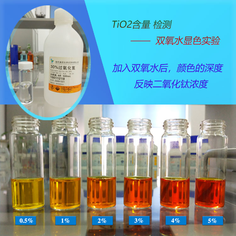 雙氧(yang)(yang)水顯色法(fa)(fa),是測試二氧(yang)(yang)化鈦含量的標準(zhun)方法(fa)(fa)。濃(nong)度(du)越高,顏色越深,隨著濃(nong)度(du)的升(sheng)高,由金(jin)黃(huang)色到橙色逐漸轉變。